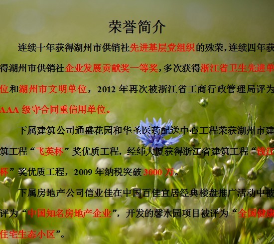 | 集團一直圍繞著“關注生命,關注環境”的產業布局方針,做強做大以房地產為龍頭,建筑、裝飾、新型材料、貿易、為輔助產業的建筑產業鏈;做精做活以制藥、化工為重要產業布局的新興產業鏈。公司連續多年被評為浙江省重合同守信用單位,連續13年被評為湖州市供銷社本級企業發展貢獻獎一等獎,并多次獲得浙江省優秀民營企業,全省供銷社50強企業,供銷社系統先進基層黨組織等榮譽稱號。 |